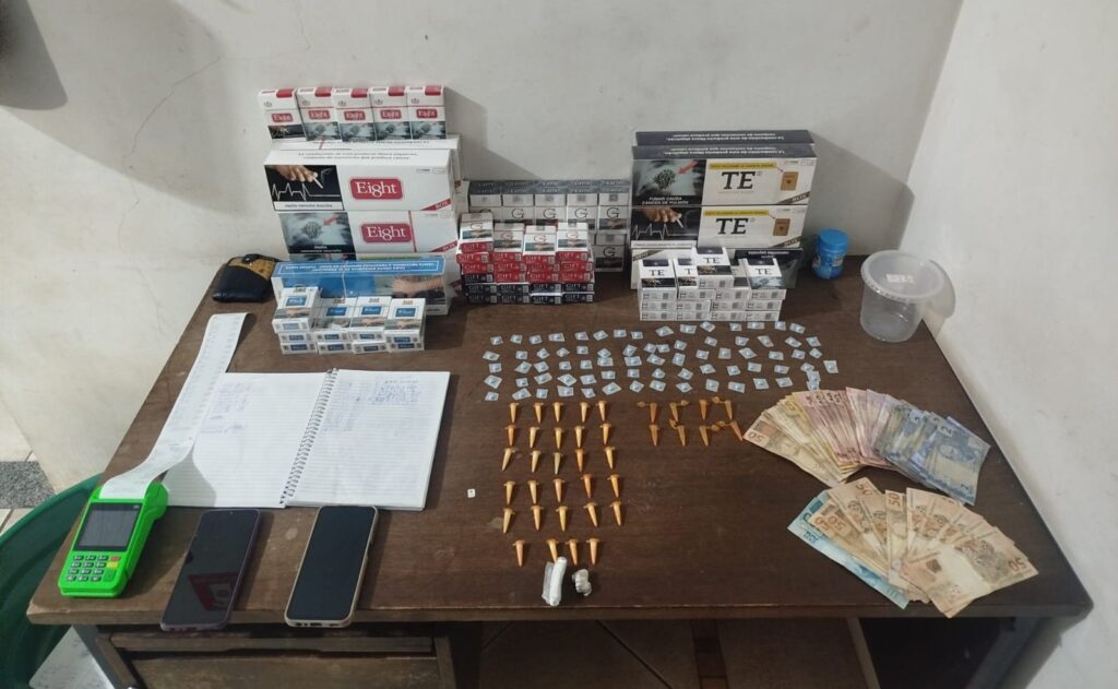 Durante as buscas minuciosas no salão comercial, os policiais localizaram um recipiente contendo diversos pinos de substância análoga à cocaína, além de um invólucro maior com a mesma droga, cuja característica era idêntica aos entorpecentes encontrados com um dos abordados inicialmente. Além das drogas, foram apreendidos dinheiro em espécie, suspeito de ser proveniente da atividade ilícita, vários aparelhos celulares, uma máquina de cartão – frequentemente utilizada em transações do tráfico de drogas – e um caderno contendo anotações que podem detalhar a contabilidade do comércio de entorpecentes. Adicionalmente, foram recolhidos comprimidos de estimulante sexual, um chip telefônico e uma grande quantidade de maços de cigarros de marcas diversas, itens que podem complementar a gama de produtos comercializados ilegalmente no local, indicando um esquema mais amplo. As evidências coletadas foram cruciais para a formalização do flagrante.