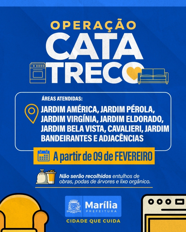 A Prefeitura de Marília, por intermédio da Secretaria Municipal do Meio Ambiente e Serviços Públicos, iniciou mais uma etapa da Operação Cata Treco. A ação, programada para ter continuidade a partir da segunda-feira, dia 9, concentra seus esforços na região Oeste do município, visando atender uma série de bairros e suas adjacências. Os moradores das comunidades América, Pérola, Virgínia, Eldorado, Bela Vista, Cavalieri e Bandeirantes são os principais beneficiados por esta iniciativa de zeladoria urbana, que busca otimizar o descarte de materiais inservíveis.