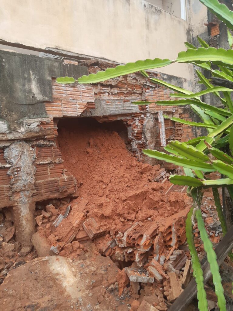 Durante a vistoria técnica, realizada na quarta-feira (29/10), foi constatado que o muro localizado na divisa com o imóvel da rua Alfeu Cesar Pedrosa, 295, cedeu completamente, provocando a movimentação de terra e comprometendo a estrutura da casa. O relatório técnico apontou como causa do incidente um vazamento em uma tubulação de abastecimento de água fria situada em frente ao imóvel, o que levou ao encharcamento do solo e ao aumento do empuxo sobre o muro, resultando no colapso.